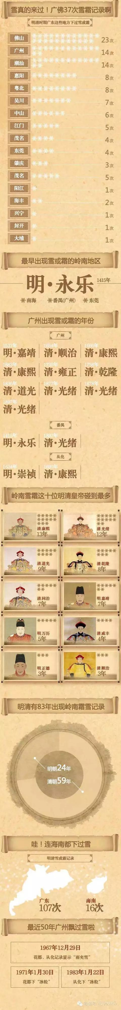 最近50年广州下雪记录是1967年,也就是48年前了!而出现冰粒有两次,分别为花都1971年1月30日,以及从化1983年1月22日。而明清时期广佛更有37次雪霜记录▼