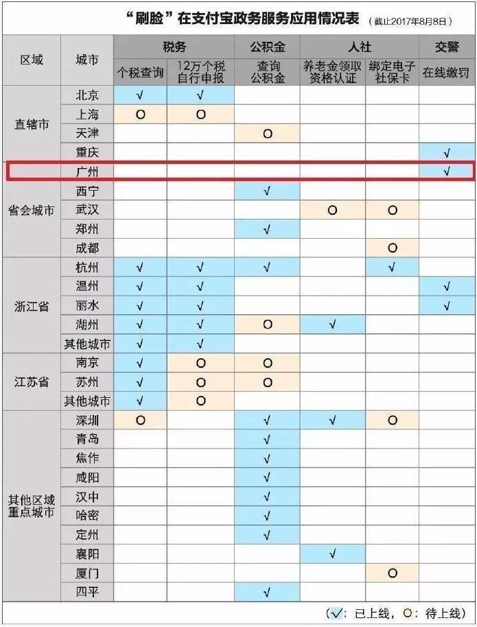 蚂蚁金服支付宝宣布,包括广州在内的全国已有40个城市都开通了“刷脸政务”,覆盖的服务类别包括查询公积金,缴纳交通罚单,个税申报等。