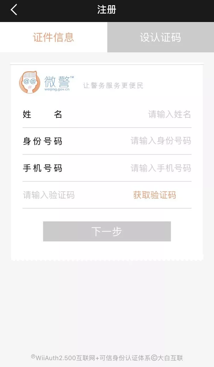 1.下载“微警认证”APP,进行录入姓名、身份证号码、身份证有效期、联系手机等信息进行注册,并成功登录微警认证程序。