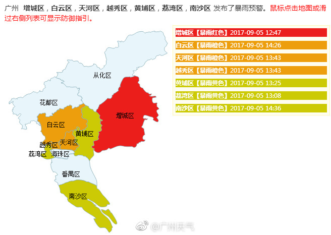 12点47分增城区已发布暴雨红色预警信号,天河区、越秀区、白云区已发布暴雨橙色预警信号,荔湾区、黄埔区、南沙区已发布暴雨黄色预警信号。(敲黑板划重点)暴雨橙色、黄色预警信号可以延迟上学!