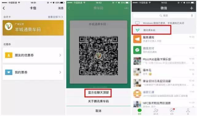 此后乘车码会自动进入微信卡包,再次使用时可在“我-卡包-会员卡”轻松找到,还可通过“显示在聊天顶部”设置,将乘车码置顶在微信聊天界面,方便快速查找和使用。
