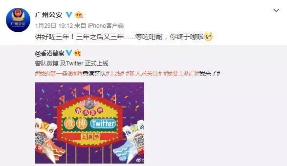 随着香港警务处的官方微博上线,全国各地公安机关的官方微博纷纷组团问候,其中“广州公安”更以港产电影《无间道》的经典粤语对白表示祝贺。进而,微博网友也纷纷在微博评论区开启“港片”对白模式疯狂“打Call”,使得警察叔叔迅速“C位出道”!