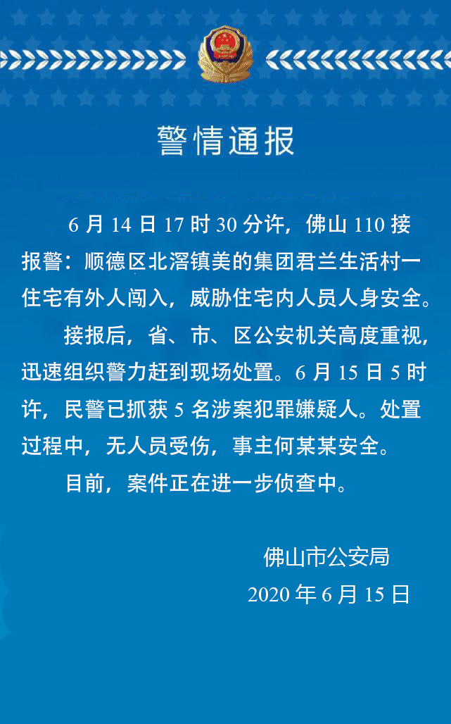 6月14日17时30分许,佛山110接报警:顺德区北渭镇美的集团君兰生活村一住宅有外人闯入,威胁住宅内人员人身安全。6月15日5时许,民警已抓获5名涉案犯罪嫌疑人。处置过程中,无人员受伤,事主何某某安全。目前,案件正在进一步侦查中。