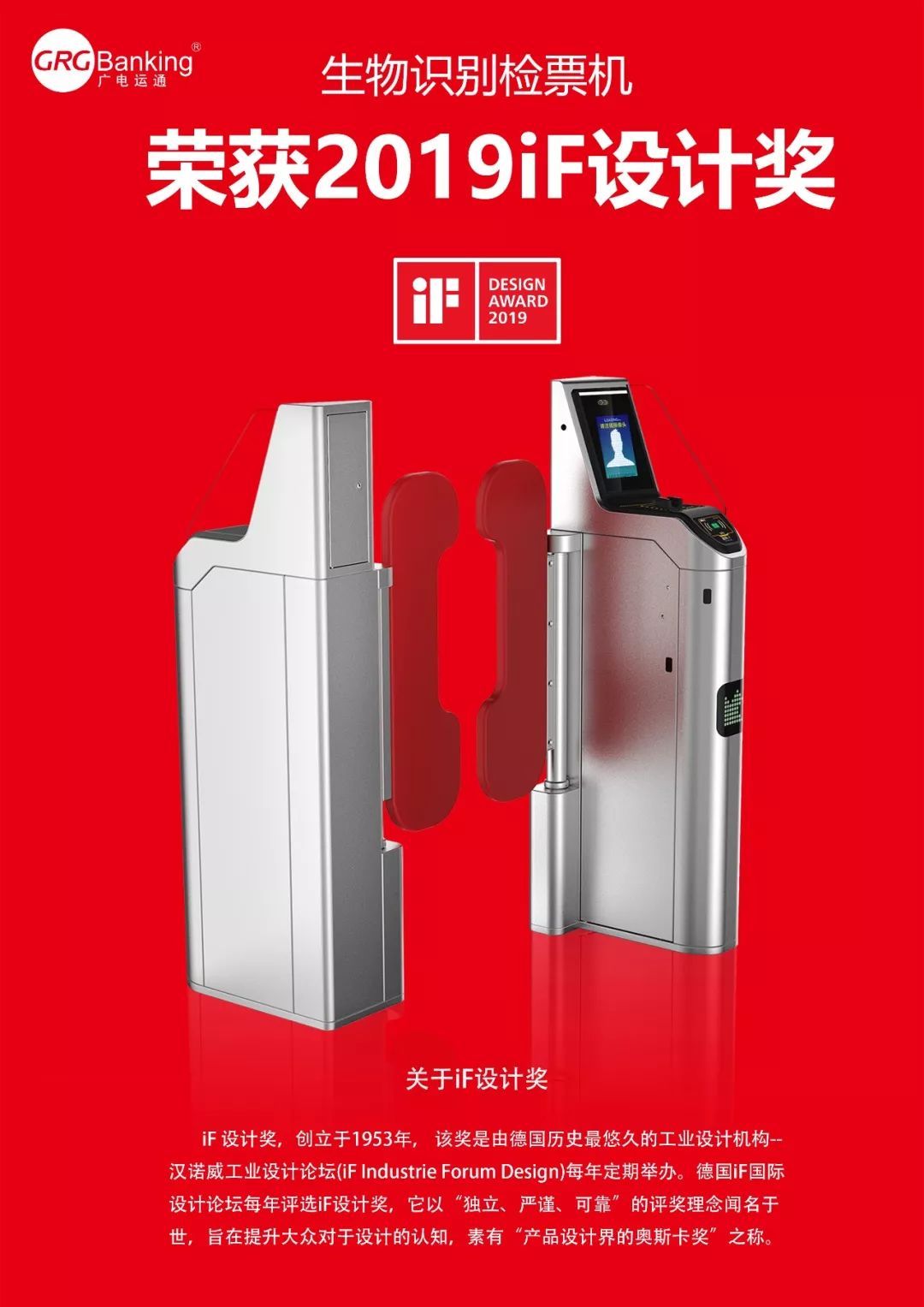 近日,广电运通联合深圳地铁集团研发的“智能生物识别检票机”,荣获素有“产品设计界奥斯卡”之称的德国iF Design Award 2019大奖,得到国际评委的全面认可,展现了广电运通出色的设计工艺和品质,开创国内AFC产品获得iF大奖的先河。