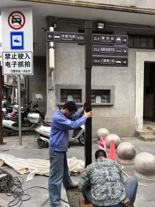 目前,标识牌基础工程已完成80%,方向指示标识安装已安装完成70%(29块),全景图及游客须知已安装完成50%(3块),景点到达及解说标识已安装完成21%(7块),全景图、服务设施标识、传统老店、公厕标识准备安装。全部标识牌系统预计于12月份施工完成。