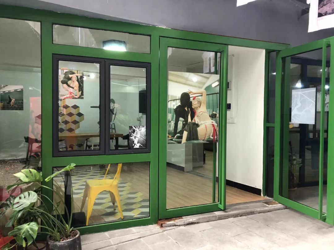 新锐时尚的摄影作品,和窄巷民房产生了神奇的化学反应,绿色的快递箱和以红色为底色的大幅摄影作品相互辉映,毫无违和感。
