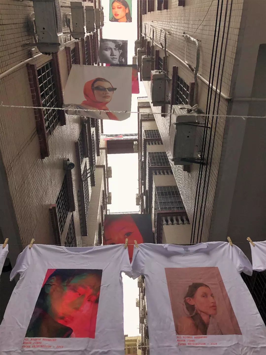 江舜在接到邀请后,于年前投入制作,大胆地将作品打印在巨幅布料和体恤衫上,并移步换景,在布展方式上富有想象力,将作品分布在楼房间的空中,让观众特别是楼里的住户,在每个角度都有全新的观感。