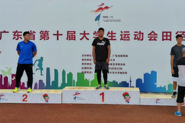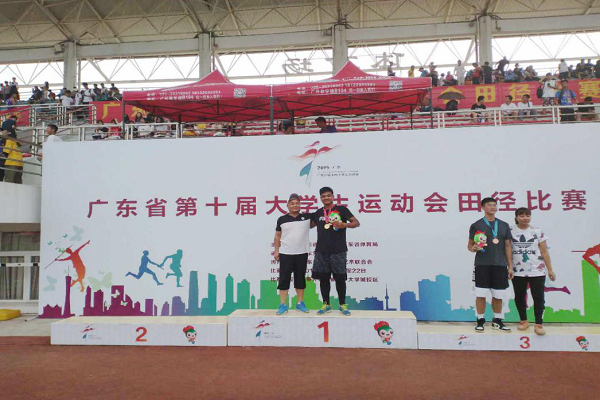 2018年,杨浩宇同学第一次参加广东省大学生田径锦标赛便以13.19米的优异成绩夺得男子男丙组铅球(7.26kg)冠军,创下了我校田径队历史最好成绩。经过教练员陆文老师的指导和他自己一年来的刻苦训练,杨浩宇奋力拼搏,誓争第一,又一次用汗水诠释了青春追梦的勇气与胆量,夺得了第二枚金灿灿的奖牌。