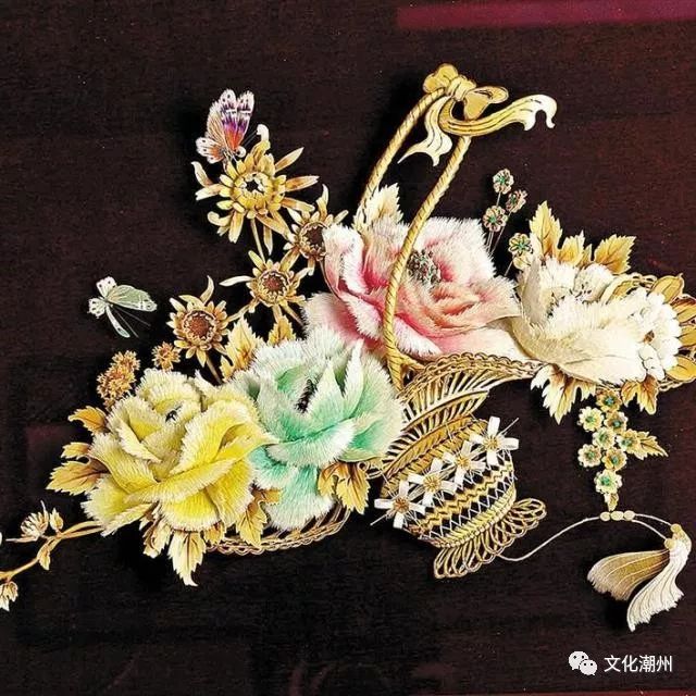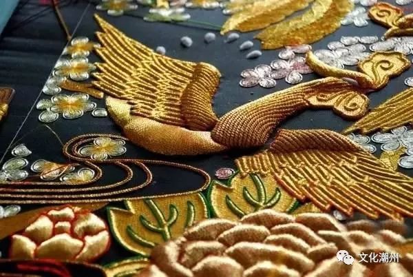 馆内潮绣作品构图饱满均衡,针法繁多,纹理清晰,金银同镶,以金碧、粗犷、雄浑的垫凸浮雕效果为世人所瞩目。