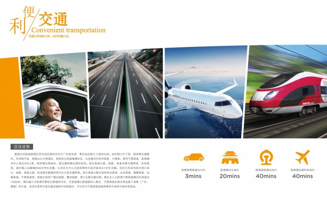 国家AAAA级旅游景区——紫莲生态旅游度假区所在地区潮州市位于广东省东部,粤东地区韩江三角洲北部。地处韩江中下游,居闽粤交通要冲。东邻饶平县,南接汕头市澄海区,西部和北部接壤潮安区,北连梅州市的丰顺县,大埔县。紧邻宁莞高速,距离潮州中心城区约5公里,毗邻潮汕高铁站、靠近揭阳潮汕国际机场。临近高速公路、铁路,具备完善交通网络,往来便利,逐步融入汕潮揭的40分钟生活圈、以项目为中心达到闽粤两大经济板块3小时生活圈。项目已形成与深水港口码头、铁路、高速公路、机场相互配套的现代化立体交通网络。其中高速公路分别有深汕高速、汕汾高速、潮惠高速、汕梅高速、宁莞高速等;铁路分别有广梅汕铁路、厦深铁路;港口主要为潮州港。景区主入口距离宁莞高速潮州东高速出口500米,潮汕揭三市客源无需经过拥堵的市区,可直接通过高速路进入景区,宁莞高速全程还将连接了闽粤(广东、福建)两大省,该项目是两大省互通连接的中间拨接点,可以作为宁莞高速连接闽粤两大省的中途休息驿站。