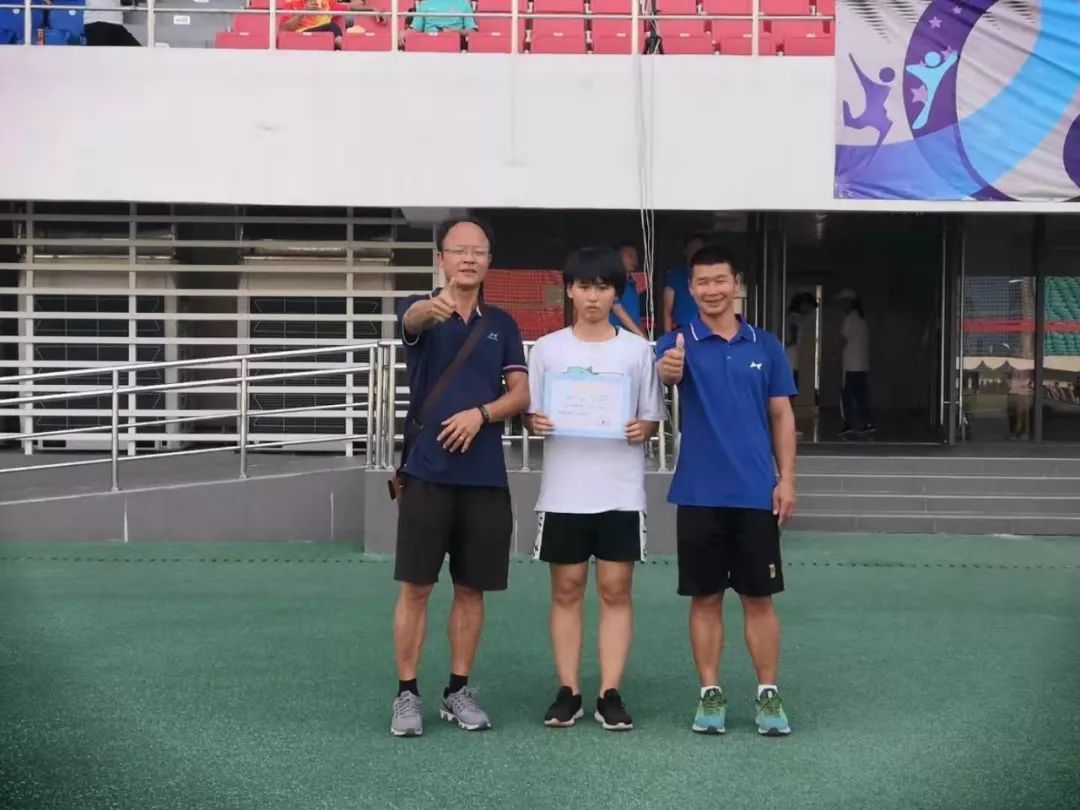 女子乙组标枪第一名张梓扬和其教练张国良、张晓生合影