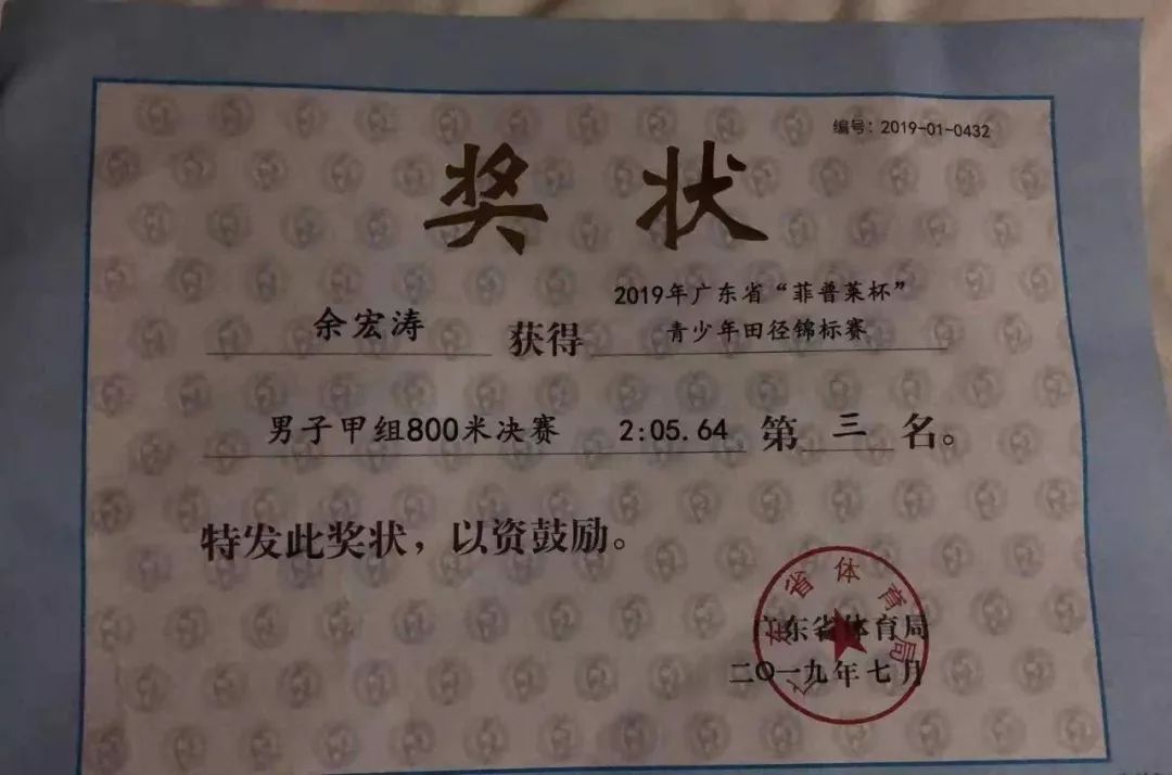 饶平县业余体校的余宏涛夺得男子甲组800米第三名