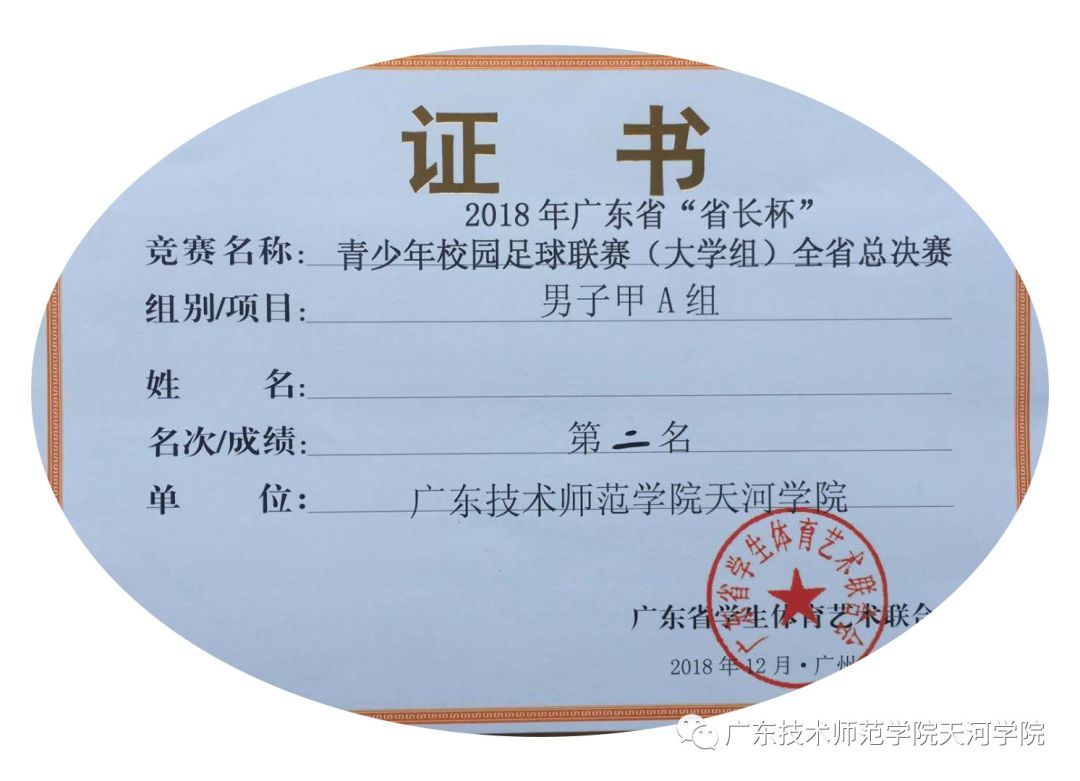 2018年广东省“省长杯”青少年足球联赛(大学组)全省总决赛甲A组第二名)。
