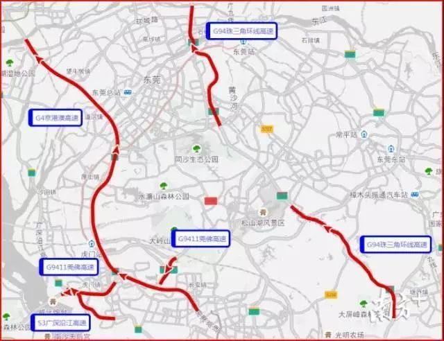 春运期间,预计1月30日将出现出城最高峰,拥堵程度较高。易拥堵缓行的高速有G9411莞佛高速、S3广深沿江高速、G94珠三角环线高速等。