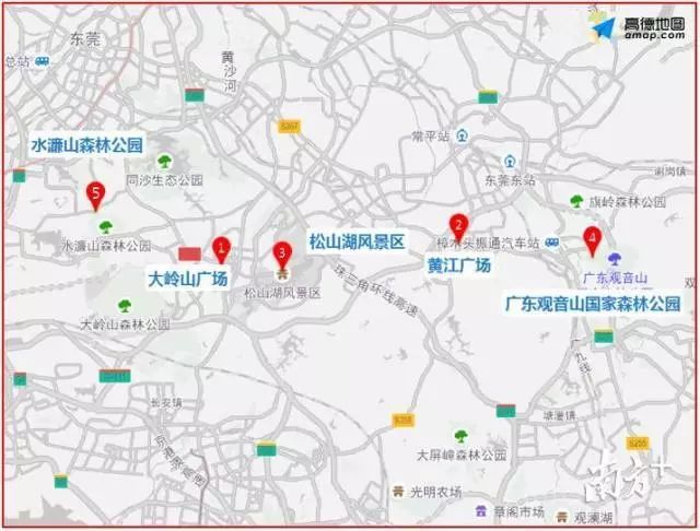 在东莞市内,预计春节期间大岭山广场最受欢迎,其次是黄江广场、松山湖风景区、广东观音山国家森林公园、水濂山森林公园。