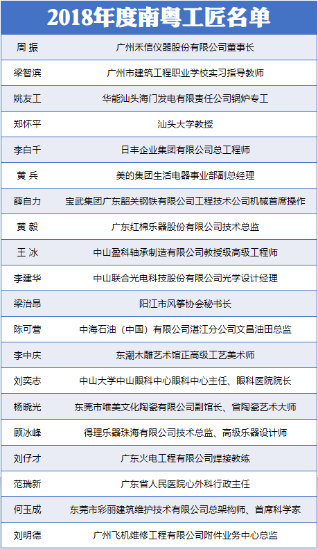 为激励各行各业在新时代建功立业,2018年,省委宣传部、省总工会联合举办了广东省敬业行动暨2018年度寻找南粤工匠活动。20名南粤工匠从全省上百名优秀工匠候选人中脱颖而出,他们中有勤勤恳恳在一线奋斗30年的机械操作师,有在世界技能大赛砌筑项目中夺冠的“90后”,更有让中国制造走向世界市场的大国工匠。