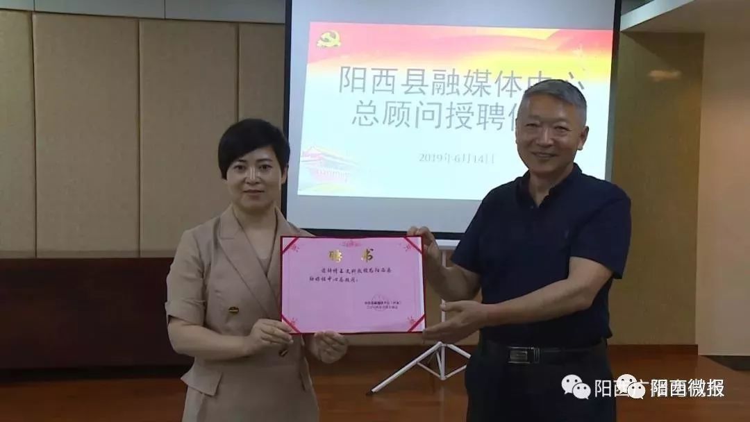 在县融媒体中心总顾问授聘仪式上,张英华为王文科教授颁发阳西县融媒体中心总顾问的聘书。