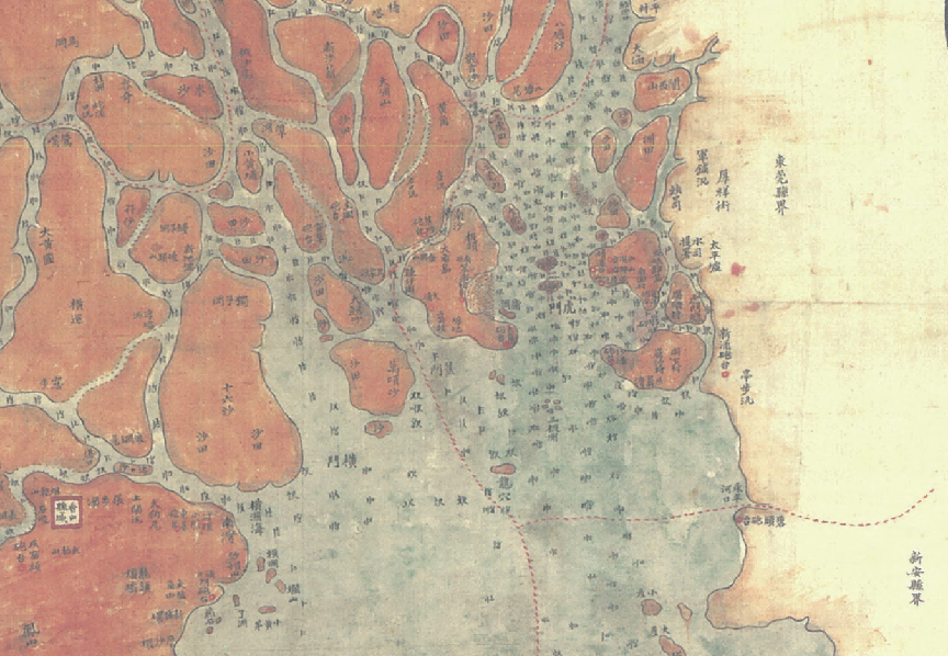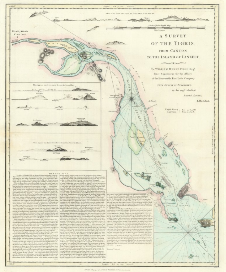 千年以来,扶胥港都是广州重要的外港。直到明代以后,由于受泥沙淤积的影响,扶胥港波罗庙码头迁移至琶洲黄埔村,始有黄埔港之名。随着对外贸易的发展,从海路来广州的船只不断增加。广州外港的地位不断提升。其后,由于琶洲黄埔村码头淤浅,不适应形势发展的要求,民国时期的1937年,在波罗庙上游6000米处兴建“黄埔新埠”,即今之黄埔老港。随着交通多元化发展,河港的功能也慢慢被进一步削弱,海港的功能不断增强。虎门作为从南方海路进入广州的门户地位愈发重要,明清时期多幅古地图都明显标示出虎门位置。其中1786年,英国人测量绘制的《珠江测量图》记载了狮子洋水道的情形,并标注了大角嘴(Tycocktow)、威远岛(Annughoy)、上下横档岛(Wangtong)、大虎(Tyfow)、二虎(Geefow)、三虎(Samfow)等岛屿的位置。当时龙穴岛还是孤悬于伶仃洋中的一个小岛,南沙大片区域和万顷沙尚未成陆,二虎和三虎还未连接在一起,狮子洋莲花山水道仍然十分宽阔。
