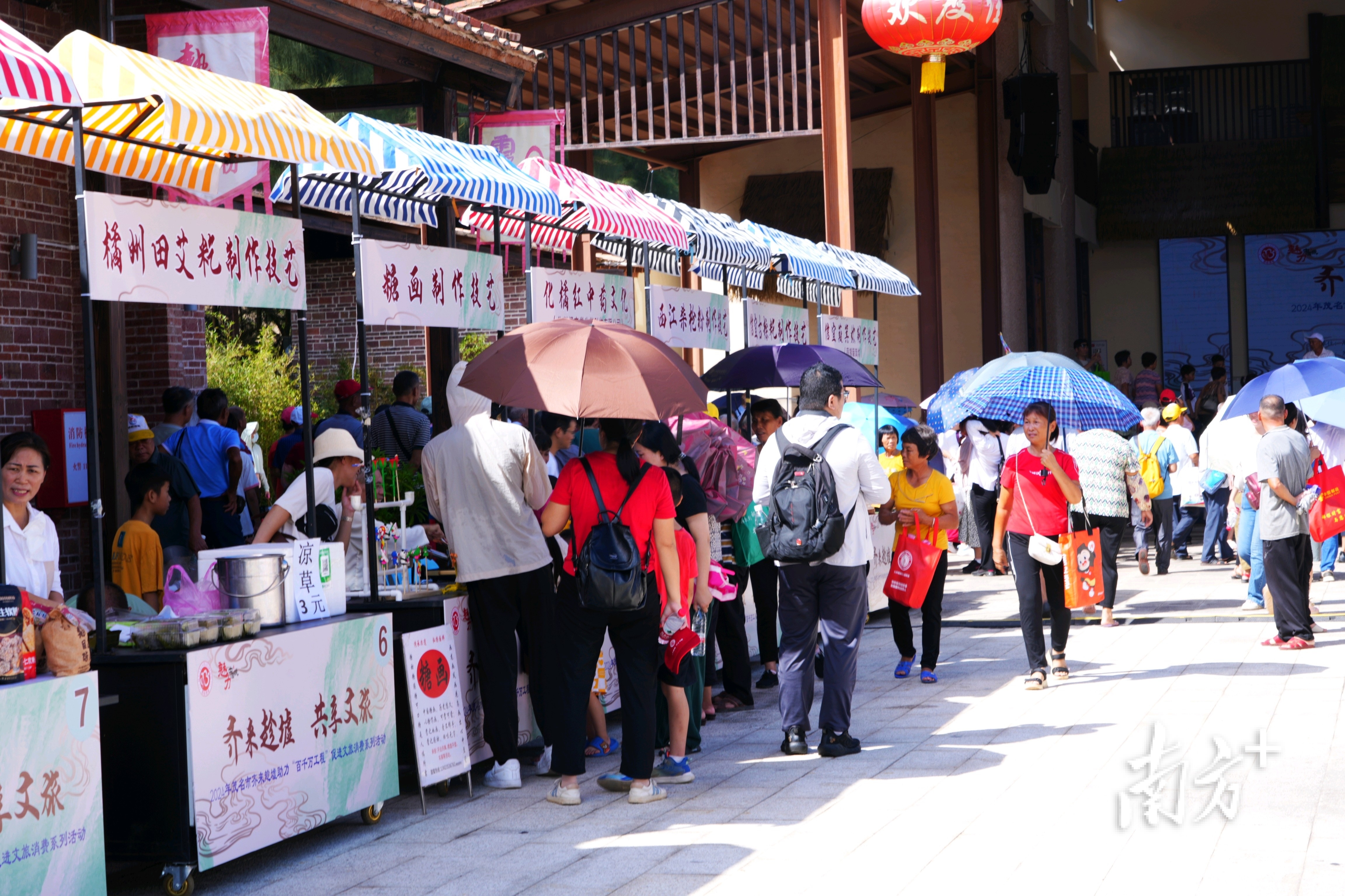 空气中弥漫着田艾籺的清香、簸箕炊的米香、麦芽糖的香甜……茂名特色非遗产品展示区,糖画、簸箕炊、橘州田艾籺、信宜凉粉、西江柴枪粉、信宜古粽籺和信宜簸箕炊等诸多美食刺激着人们的味蕾,此时已成为人们视线的焦点所在。孩子们对糖画的制作过程充满好奇,目不转睛地盯着糖艺师傅手中的勺子,仿佛在看一场魔术表演;而大人们则对化橘红、沉香等特色产品赞不绝口,不时驻足,咨询了解。