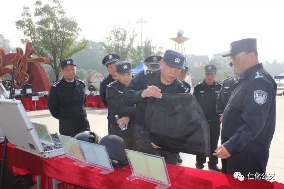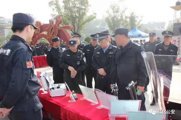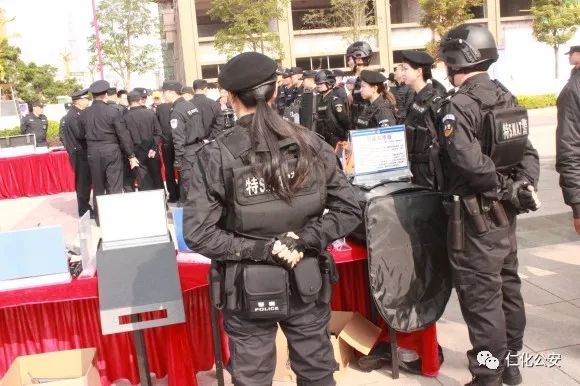场内演练结束后,领导与现场观众参观了三支特警队伍各自展示的高端精良的枪类、防爆装备等特警装备,这些装备是特警队伍“能打仗,打胜仗”的重要保障。