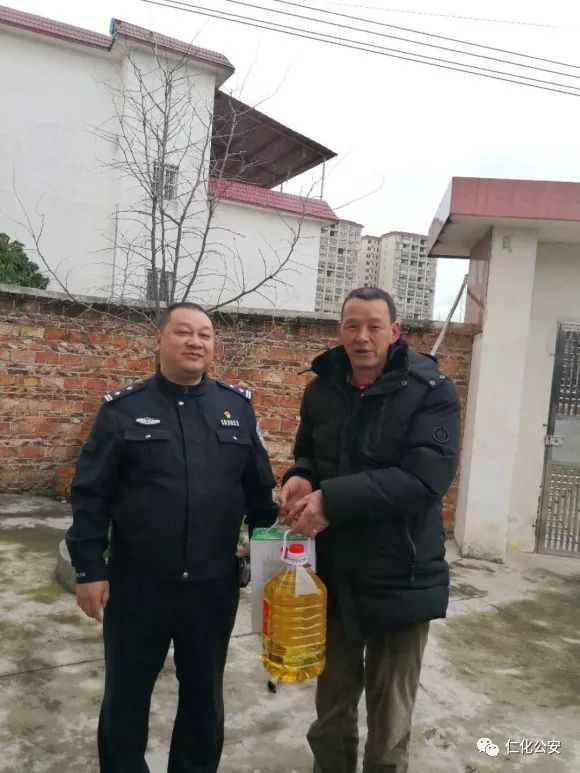 2月11日上午,八支部党员民警来到丹霞街道狮井村帮扶贫困户家中走访慰问,并送上油、牛奶等慰问物资。