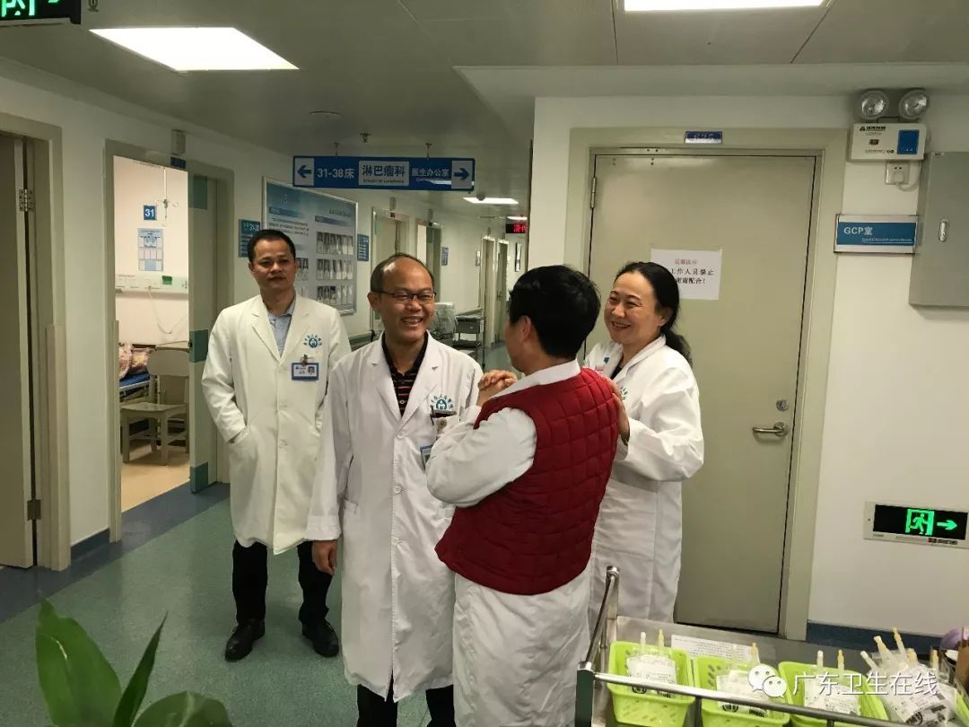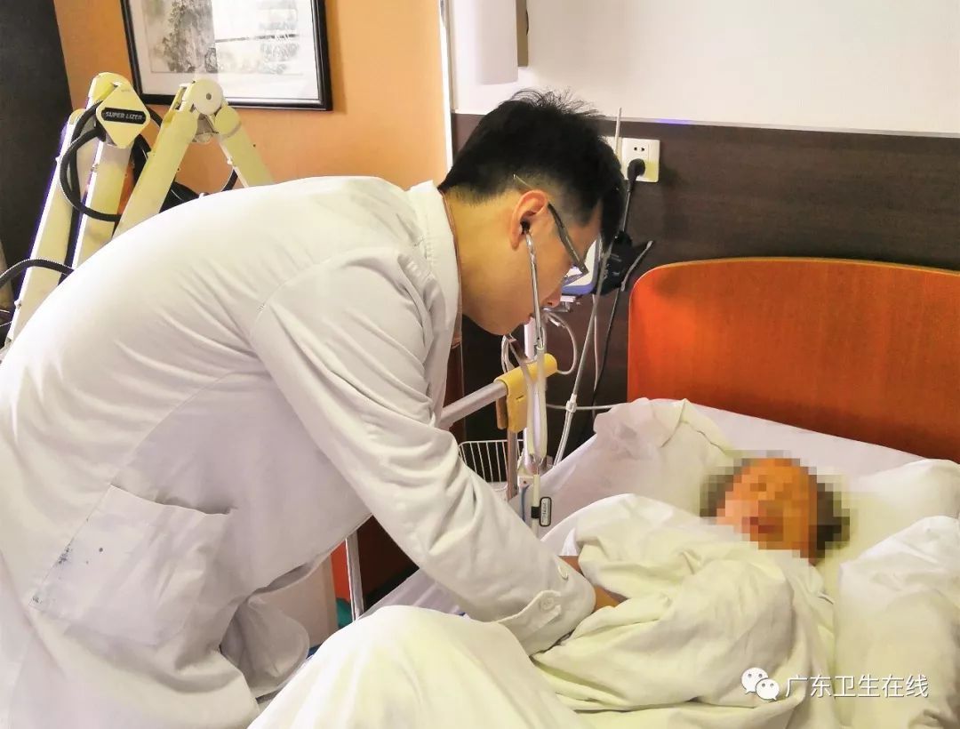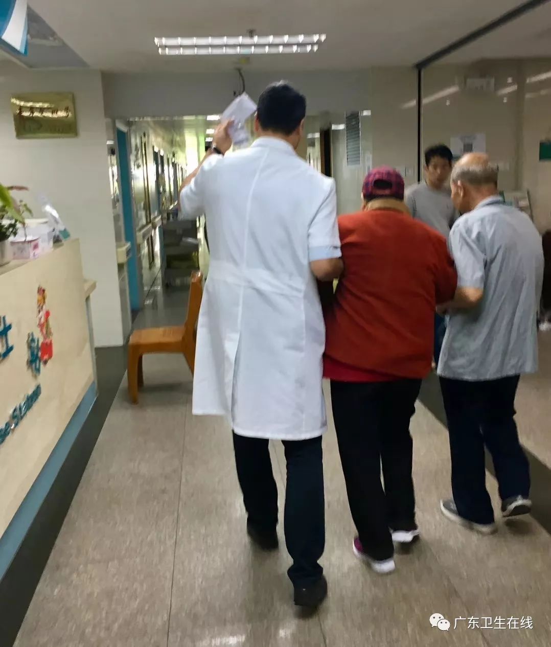 广东省第二人民医院肿瘤二科医生在病房巡视时发现两位老人艰难前行,立即上前一边搀扶着老人一边提着输液瓶。