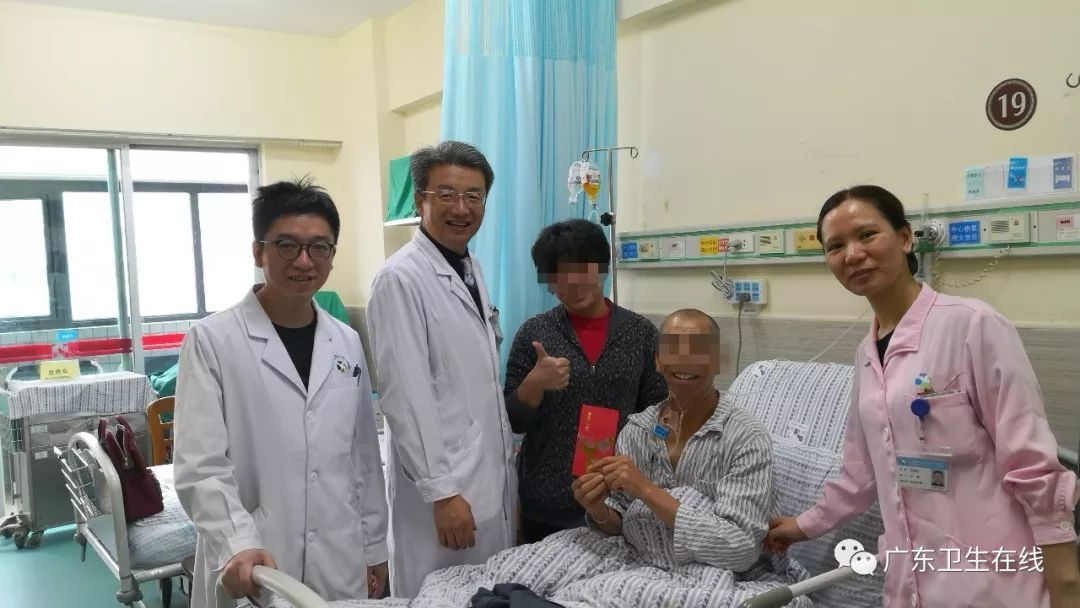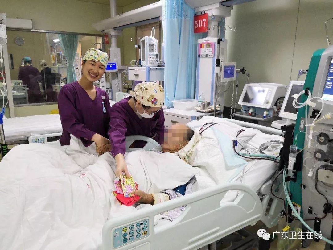 中山大学附属第一医院急诊重症监护室护士给70岁老伯派利是,祝愿他早日康复出院。大叔刚接受完肾移植术,经过医护人员专业治疗、悉心照顾一个月后,顺利脱机拔管,转至普通病房。