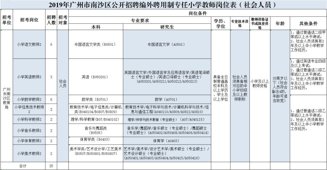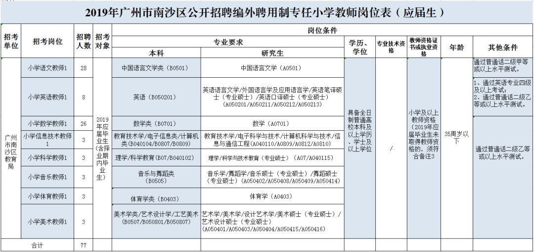 招聘岗位及人数:本次共招聘编外聘用制专任小学教师102名(签订劳动合同,不纳入机构编制管理),包括应届毕业生77名,社会人员25名,由南沙区教育局统一组织招聘,统一分配至区内公办小学。