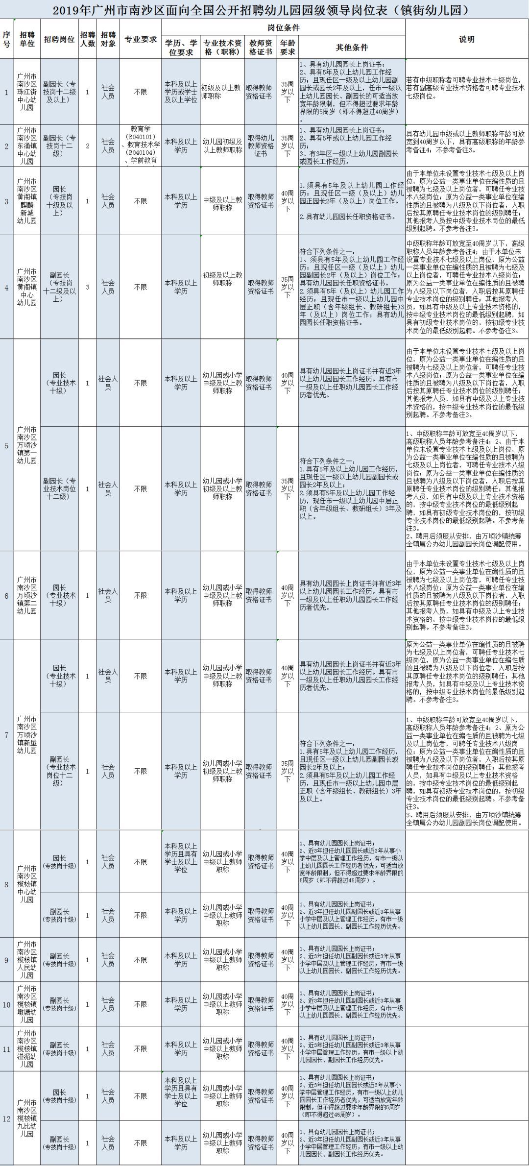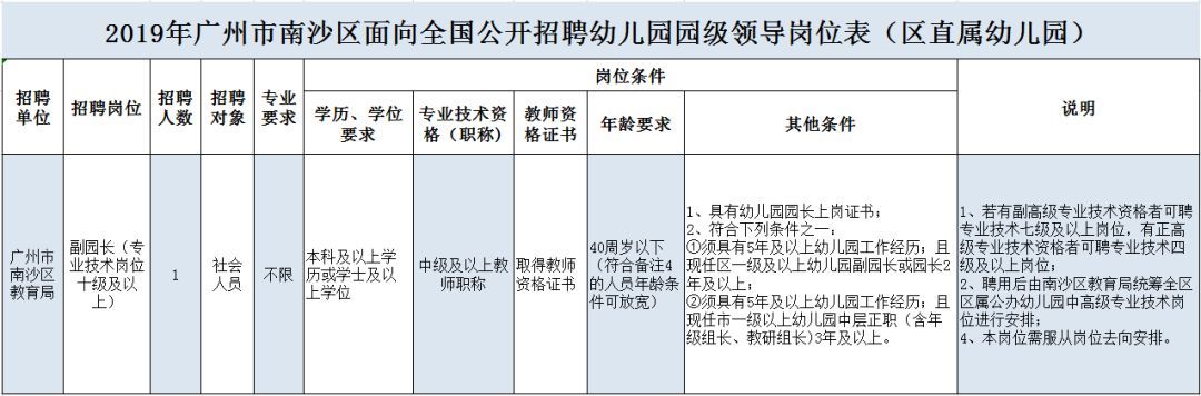 南沙区面向全国公开招聘20名幼儿园园级领导。其中招聘区直属幼儿园园级领导1名;镇街属幼儿园园级领导19名。年龄、工作年限的计算时间截止至2019年5月31日。