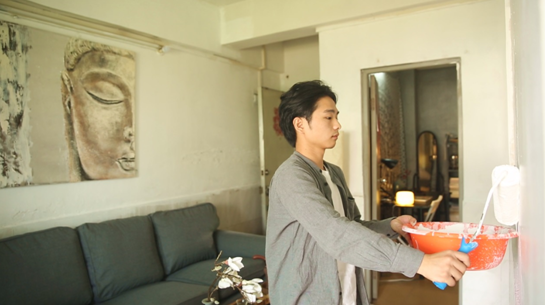 他平时在家喜欢泡泡茶,冲咖啡,喝冰镇饮料,看电影,看书,发呆。爱好蛮多的,除了运动出汗之外基本都是宅在家里坐着。所以居住的舒适感是他首先要考虑的。