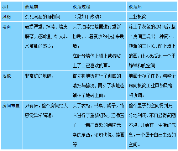 ●改造亮点:陈霁笙租住的小屋位于深圳龙华新区,与哥嫂合租,自行改造仅8平方米的储物间作为卧室,12小时极速完工,总共只花费2600元,改造后极具个人特色,空间视觉效果让人眼前一亮。