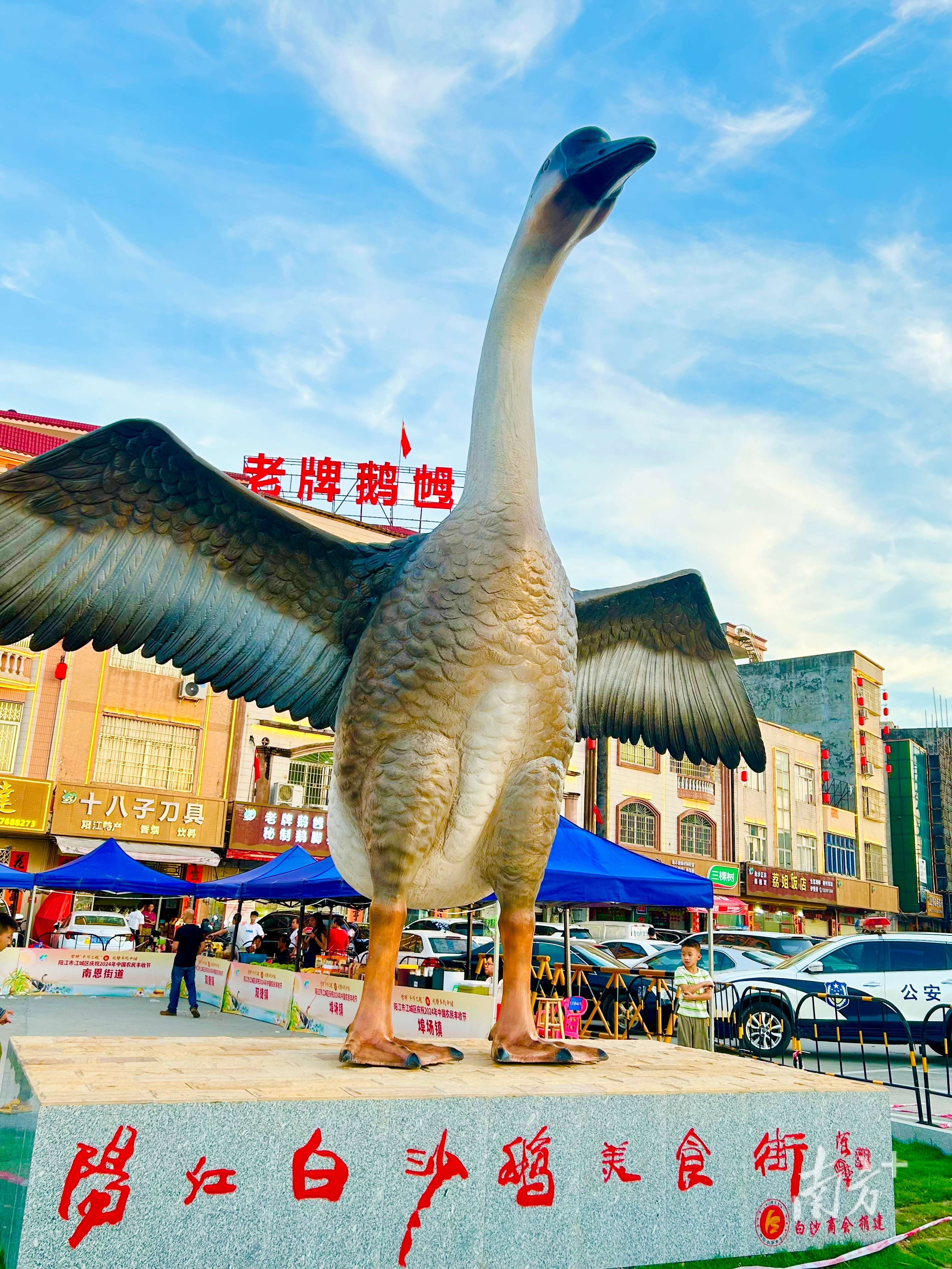 本次活动由阳江市江城区“百千万工程”指挥部办公室、江城区农业农村局指导,白沙街道办事处、白沙街道商会主办。据悉,自今年7月起这座高5米、翅展长达7米的鹅雕像“空降”江城区白沙街道后,不少群众慕名而来,而这座雕像,正是白沙街道致力打造的白沙鹅美食一条街的标志性建筑。