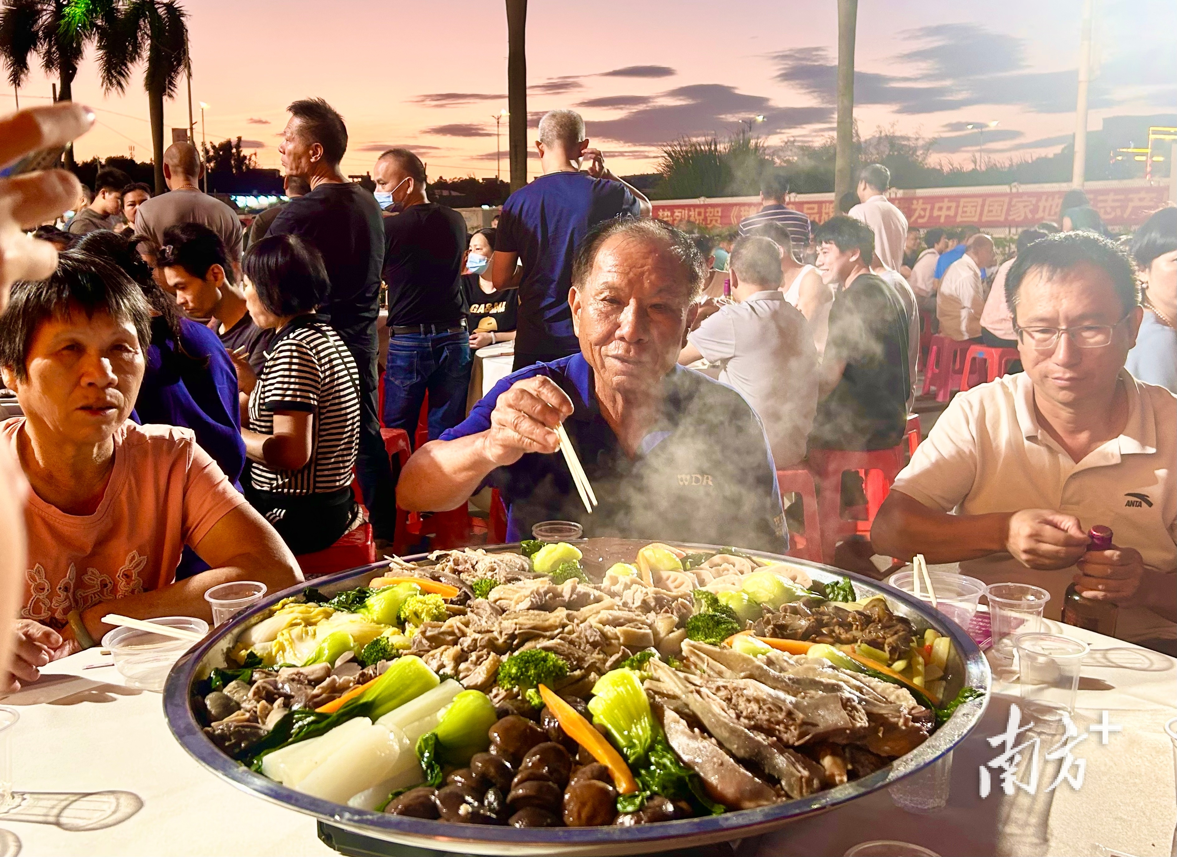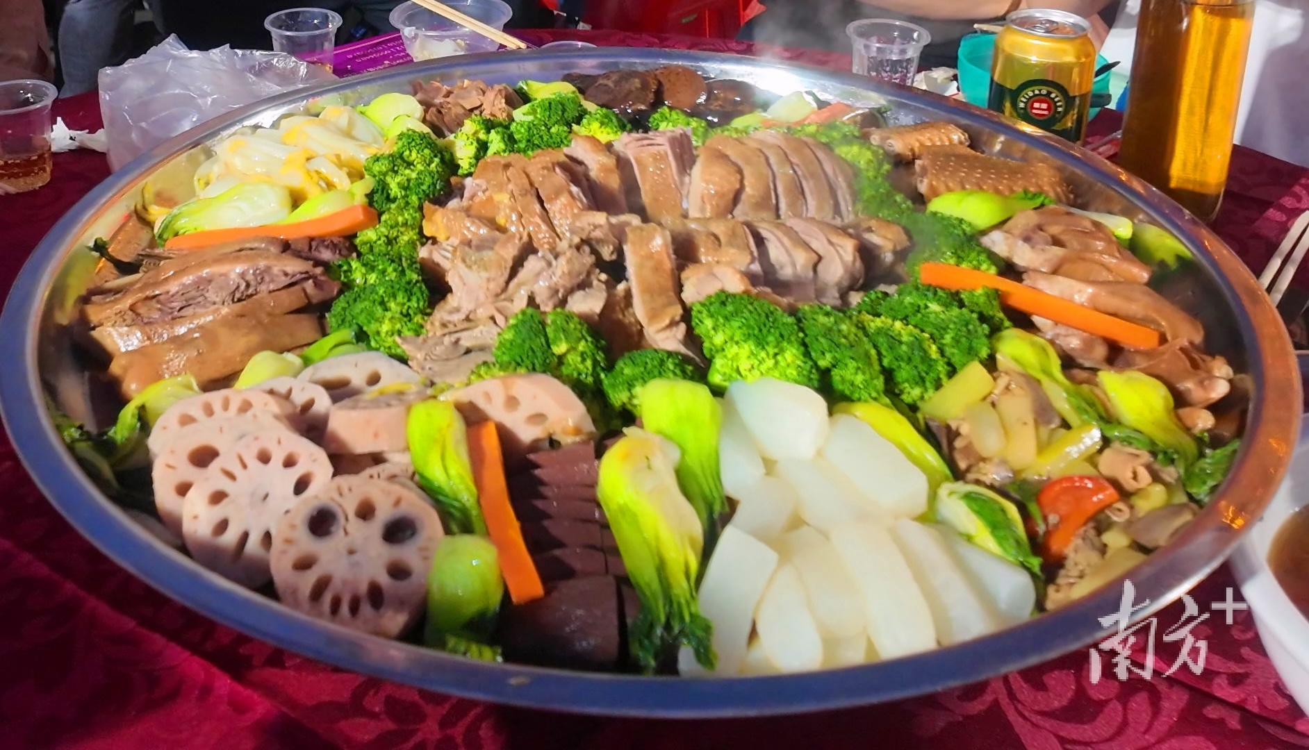 “来来来,上菜了!”伴随着开场节目《渔谷丰收、欢乐连连》表演,工作人员把一盘盘香喷喷的白沙麻香白切鹅大盘菜端上饭桌,引得食客们食指大动。色泽和新鲜口感引起赞叹一片,四溢的香味弥漫街头。