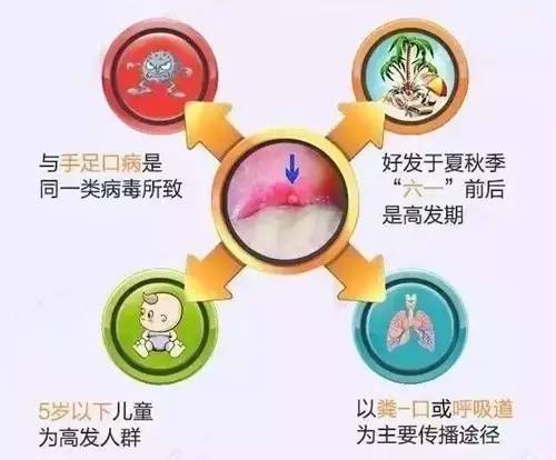 手足口病的隐性传染率高,可通过感染者的粪便、咽喉分泌物、唾液和疱疹液等广泛传播,传染性极强,易引起暴发或流行,多发生于5岁以内的婴幼儿,它由肠道病毒引起,感染人体后,主要与咽部和肠道上皮细胞表面相应的病毒受体结合,再进一步侵犯到患儿口腔内颊部、舌、软腭、硬腭、口唇内侧、手足心、肘、膝、臀部和前阴等部位,归纳起来就是主要侵犯手、足、口、臀四个部位。