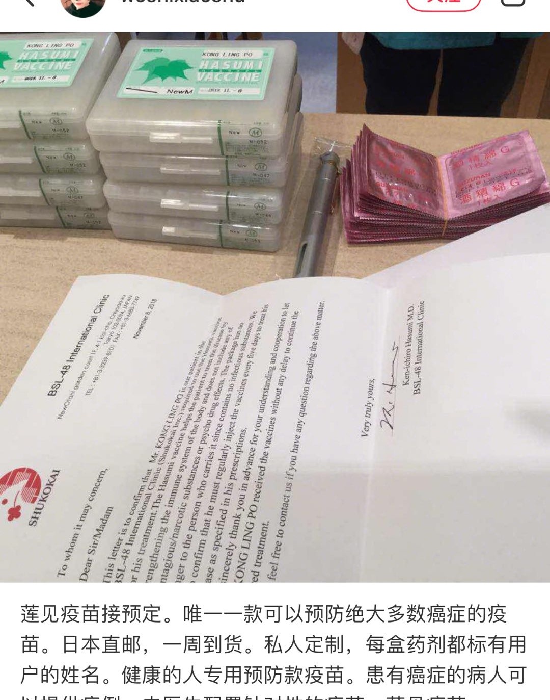 到底何为“莲见疫苗”?根据网上公开资料显示,该疫苗“由日本莲见喜一郎于1948年研发而成,并历经数十年发展”“2005年已经在日本正式上市,并获得美国FDA认证,已经有数万人接受了治疗”。记者在小红书、微博等社交平台上看到,关于“莲见疫苗”的介绍大同小异,分为癌症预防型和癌症治疗型,前者可以通过邮寄渠道购买自行注射,后者需要到日本诊所进行私人定制。
