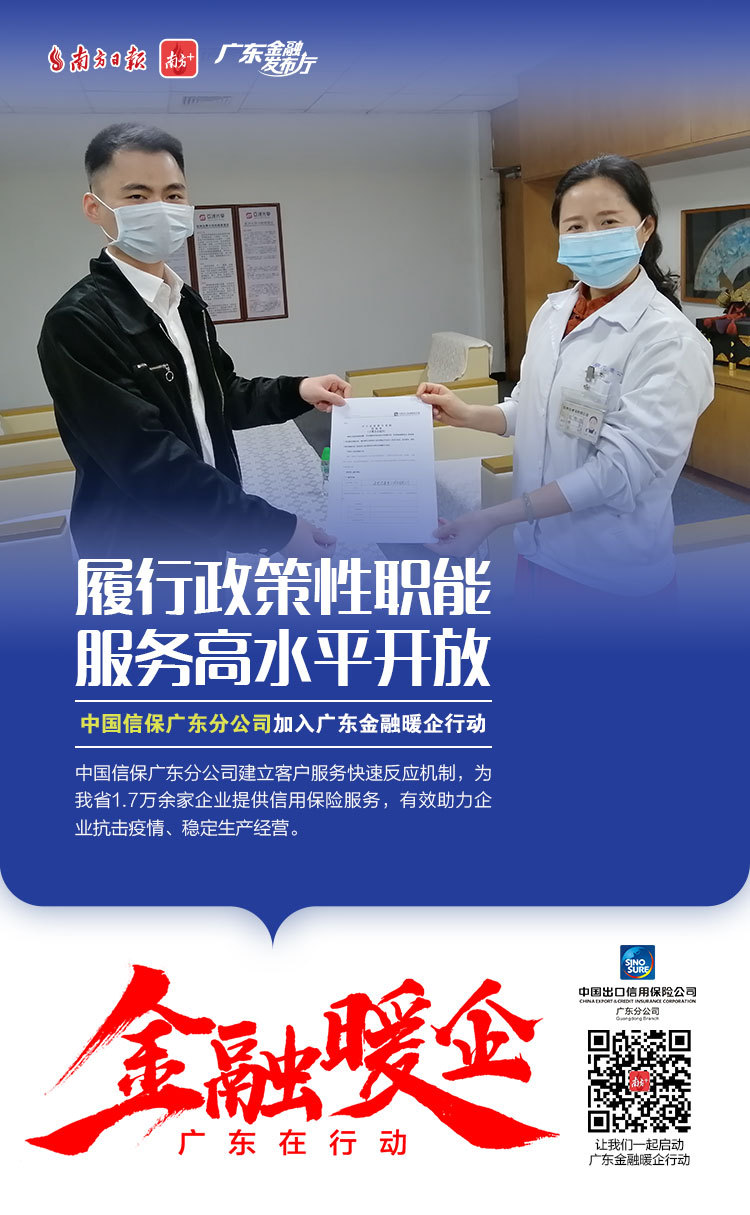 中国信保广东分公司积极履行政策性职能,不断创新服务方式、细化服务举措,建立客户服务快速反应机制,全力保障我省“一带一路”建设重点项目顺利执行,强化对小微企业的服务支持,开辟理赔绿色服务通道,支持企业抗击疫情,促进我省外贸增长。2020年1-3月,中国信保广东分公司累计支持的国内外贸易和投资规模205亿美元,同比增长14%。其中,在短期出口信用保险项下,服务企业1.7万余家,同比增长17%;累计向企业赔付2000余万美元,同比增长13%,帮助企业有效降低损失。