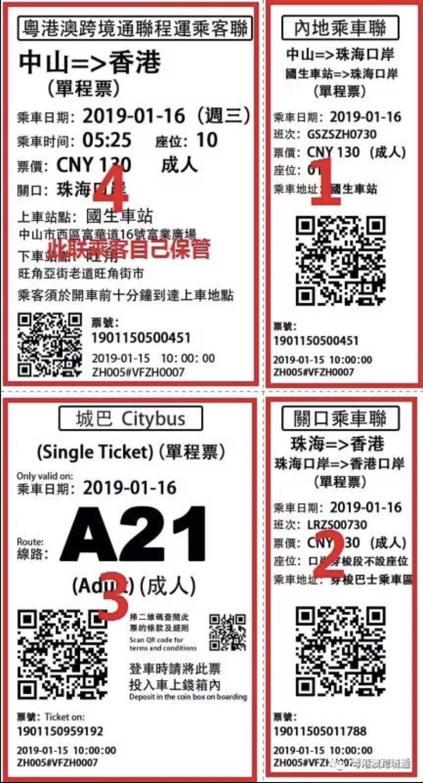 目前,市民使用配套巴士及联程联运服务可享受直达香港市区的(从起点至目的地)全程交通服务,“一票四联”通行,每票联对应内运段、大桥穿梭巴士段、香港市区段换乘,乘客无需在各口岸重复排队购票乘车,即可实现内地到香港或澳门市区的配套联程联运一票通行服务,真正实现“一键下单、无缝换乘、一票通行”。