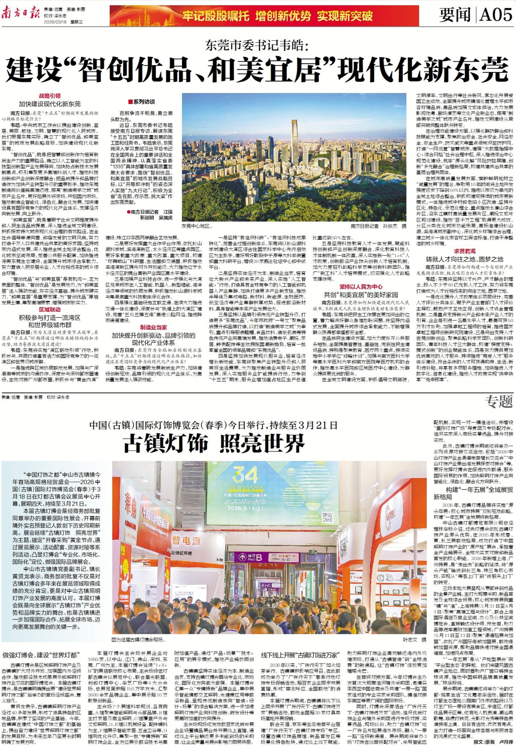 近日,东莞市委书记韦皓接受南方日报专访,解读东莞“十五五”时期高质量发展的施工图和任务书。韦皓表示,东莞将深入学习贯彻习近平总书记在全国两会上的重要讲话和全国两会精神,认真落实省委“1310”具体部署和省高质量发展大会要求,围绕“智创优品、和美宜居”的城市发展战略目标,以“开局即冲刺”的姿态深入实施“九大行动”,积极为全省“走在前、作示范、挑大梁”作出东莞贡献。