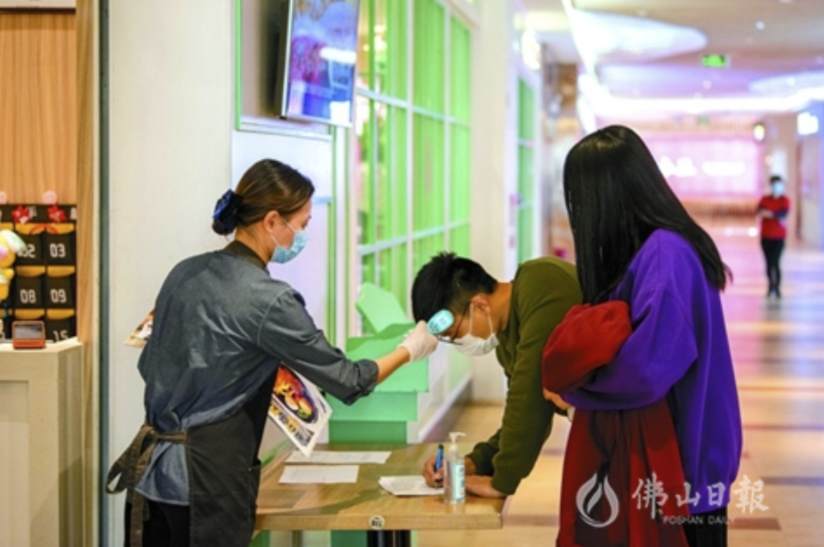 “你好,请做入店登记,并测量体温。”5日中午12点,记者来到三水万达广场,已有部分餐饮门店在做好防疫工作的前提下开放堂食服务,服务员要求每一位进店食客做好健康登记。