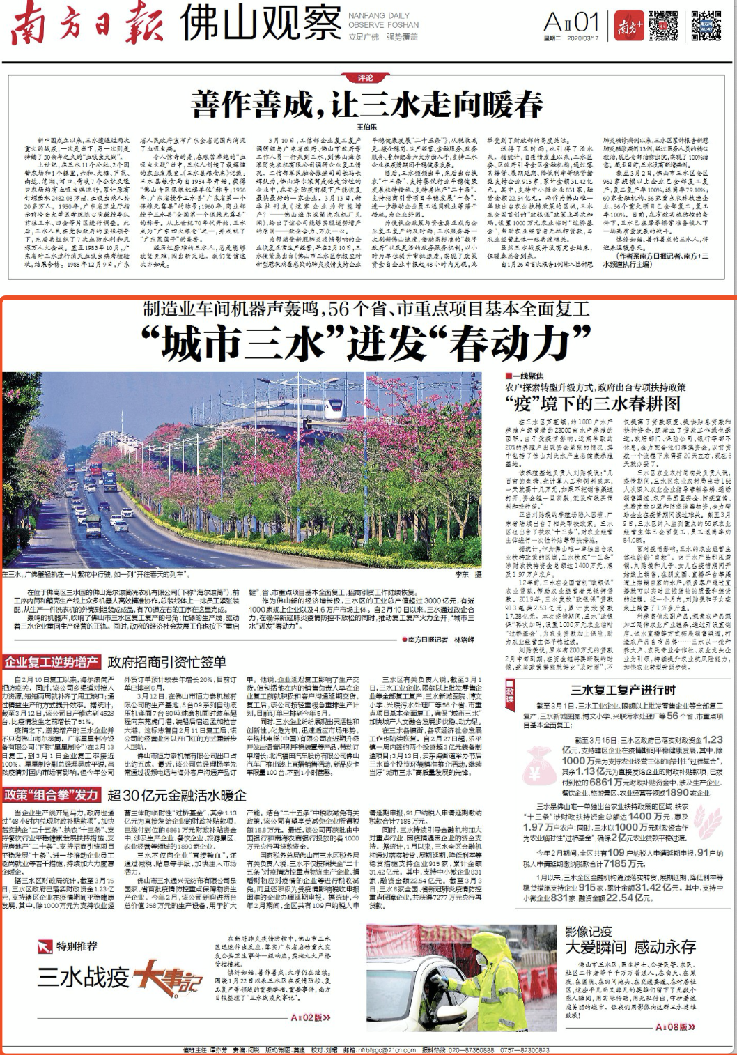 三水区有关负责人说,截至3月1日,三水工业企业、限额以上批发零售企业等全部复工复产,三水新城医院、博文小学、兴联污水处理厂等56个省、市重点项目基本全面复工,确保“城市三水”加快城产人文融合发展步伐稳、动力足。