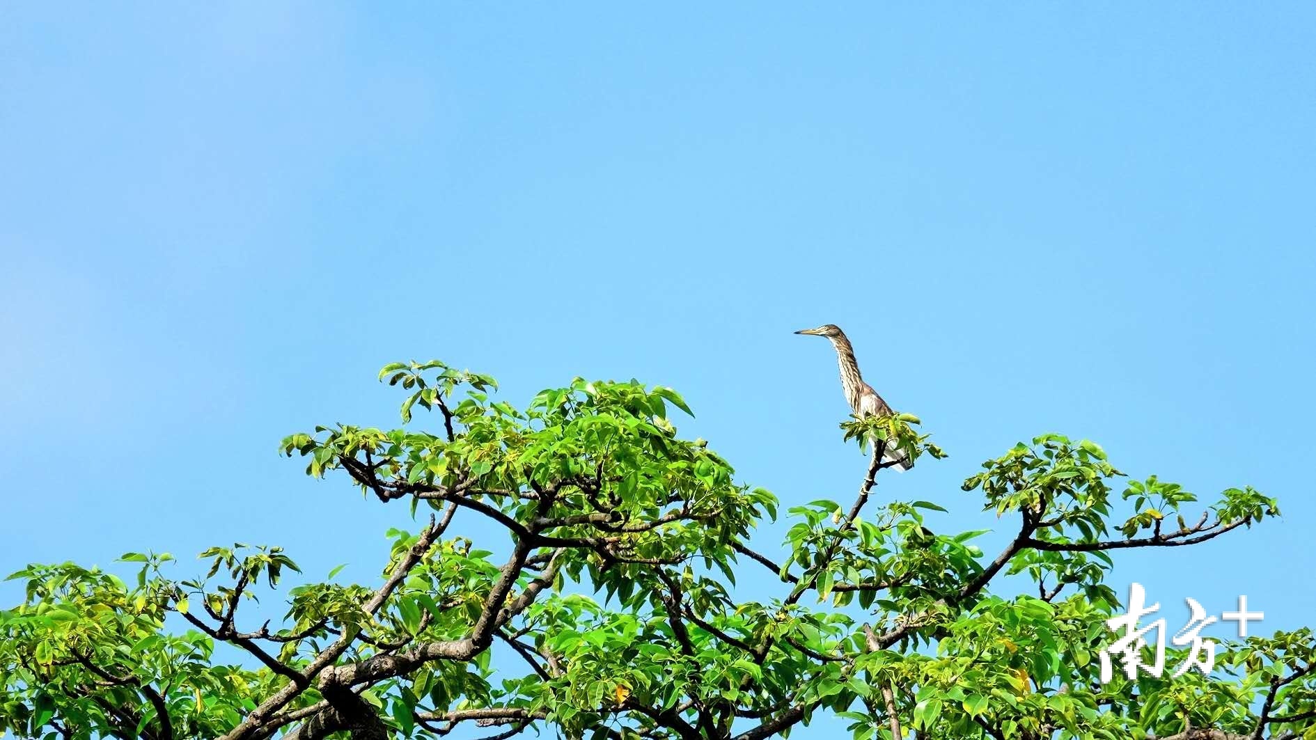 一只池鹭亚成鸟停留在郁郁葱葱的大树上。
