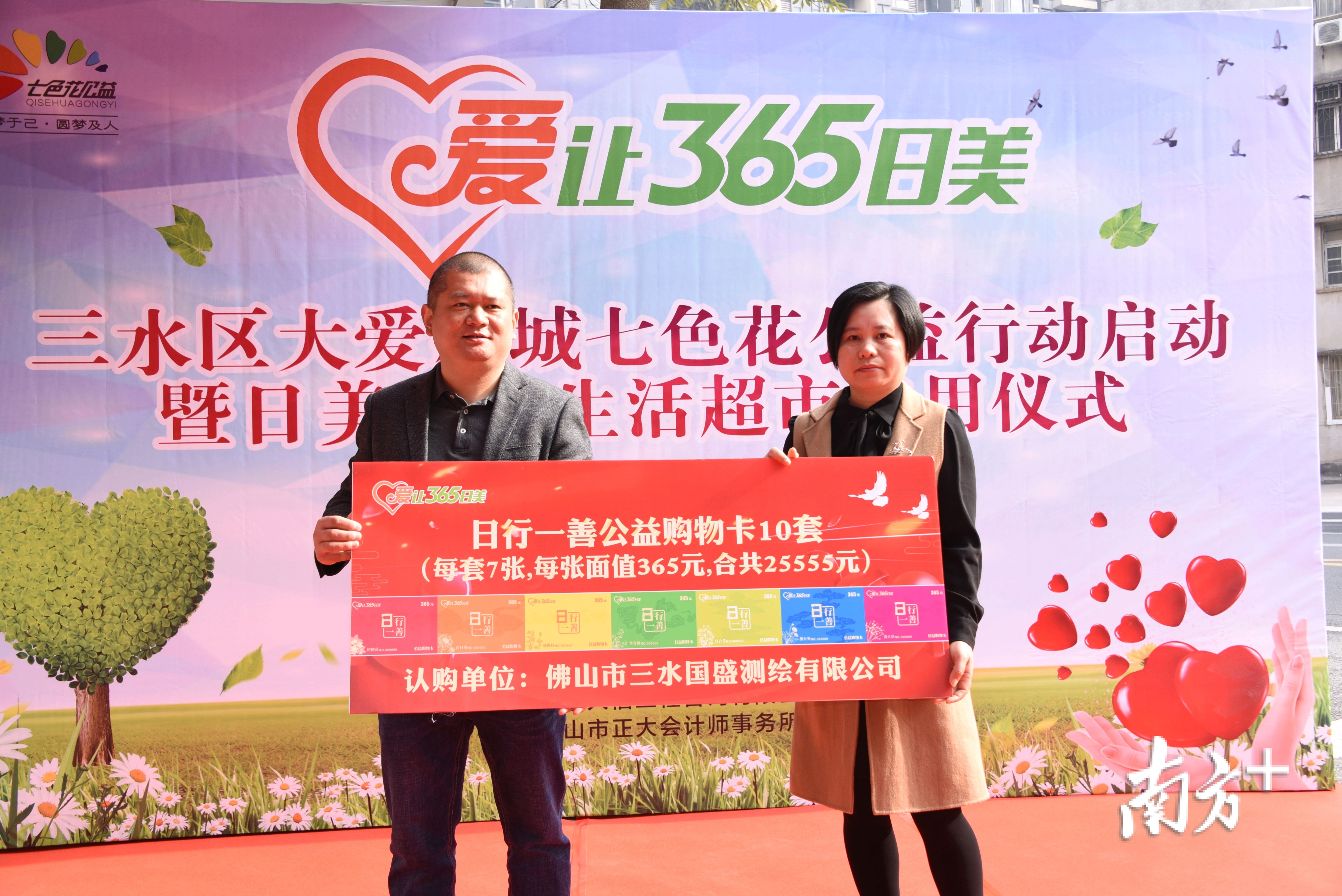 启动仪式上,佛山市七色花社会工作服务中心依托公益超市也开始实施“桔梗花计划”,首次推广发行每套7张(红橙黄绿青蓝紫7种颜色、配上7种花卉、每张面值365元)的日行一善公益购物卡。三水区西南总商会、佛山市三水国盛测绘有限公司、广东新达测绘科技有限公司、广东人信工程咨询有限公司三水分公司分别现场认购了10套日行一善公益卡,日美生活超市和广东运昌隆后勤科技有限公司也分别现场向大爱淼城七色花公益行动捐款3万元和5000元。