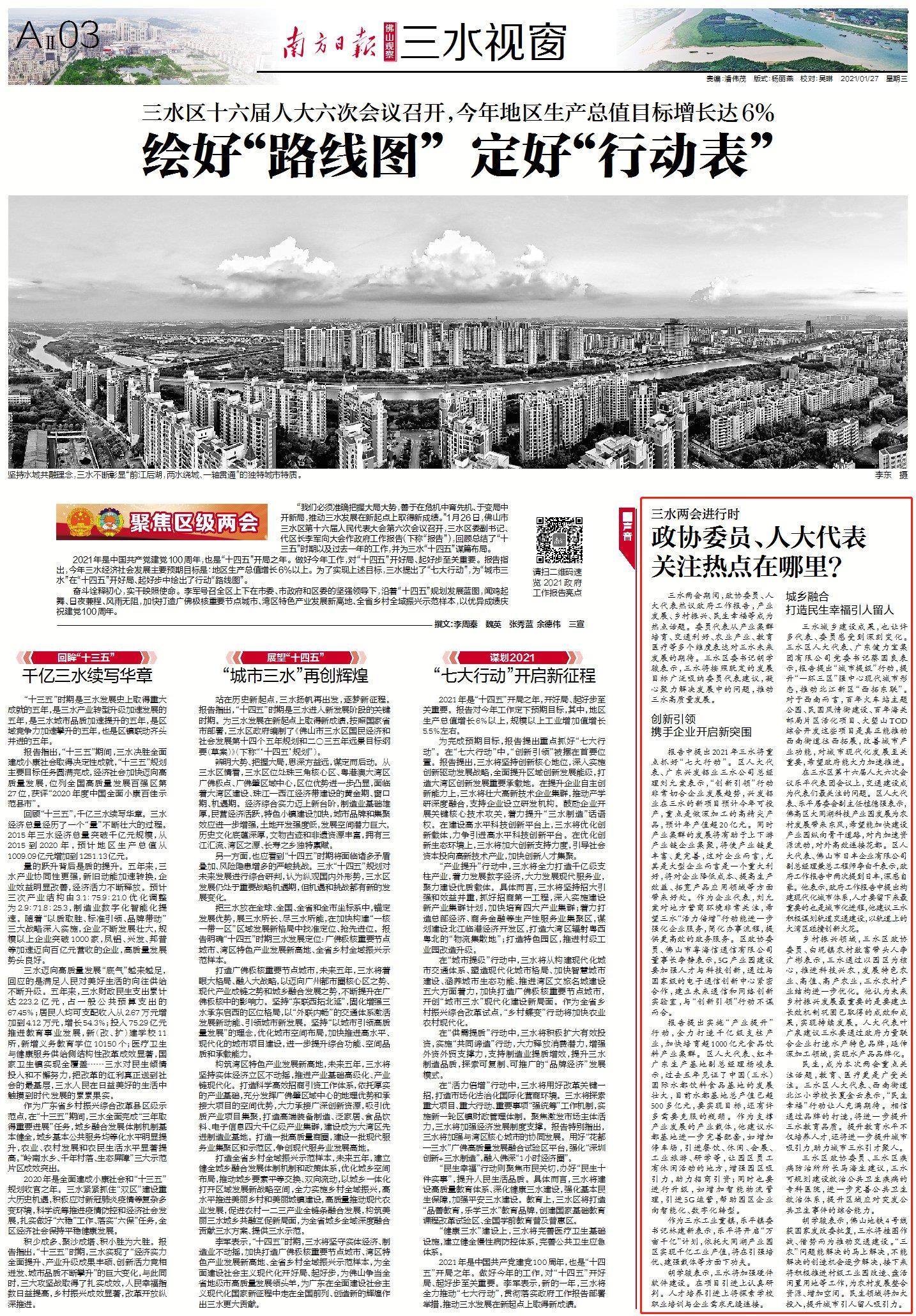 报告中提出2021年三水将重点抓好“七大行动”。区人大代表、广东兴发铝业三水公司总经理刘允棠表示,“创新引领”行动非常切合企业发展趋势,兴发铝业在三水的新项目预计今年可投产,重点是做深加工的高精尖产品,预计年产值超20亿元。同时产业集群的发展将有助于上下游产业链企业集聚,将使产业链更丰富、更完善,这对企业而言,尤其是大型企业而言是一个重大利好,将对企业降低成本、提高生产效益、拓宽产品应用领域等方面带来好处。作为企业代表,刘允棠对地方营商环境非常关注,希望三水“活力倍增”行动能进一步强化企业服务,简化办事流程,提供更高效的政务服务。区政协委员、佛山市粤海信通信有限公司董事长李静表示,5G产业园建设要加强人才与科技创新,通过与国家级的电子通信创新中心紧密合作,建立未来通信和网络创新实验室,与“创新引领”行动不谋而合。