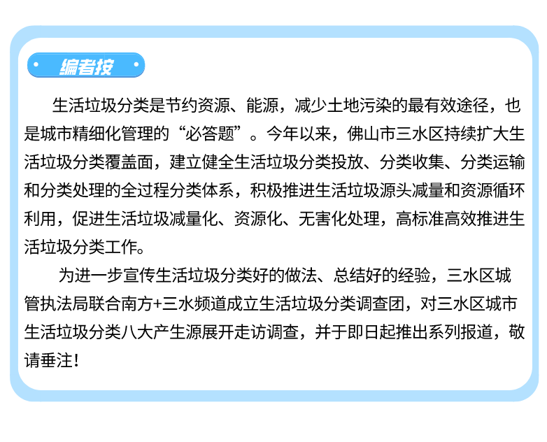 “小区有多少个分类投放点?”“收运时间怎么安排?”“平时怎样开展生活垃圾分类宣传活动?”近日,三水区生活垃圾分类调查团先后走进西南街道北江社区和云东海街道映海南社区开展居住区生活垃圾分类专项观察。