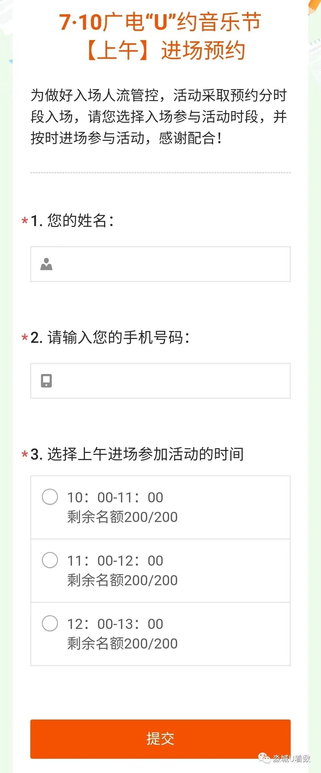 3、通过小程序填写个人信息并选择具体进场时段,点击提交,便可完成预约(数量有限,请尽快预约)。