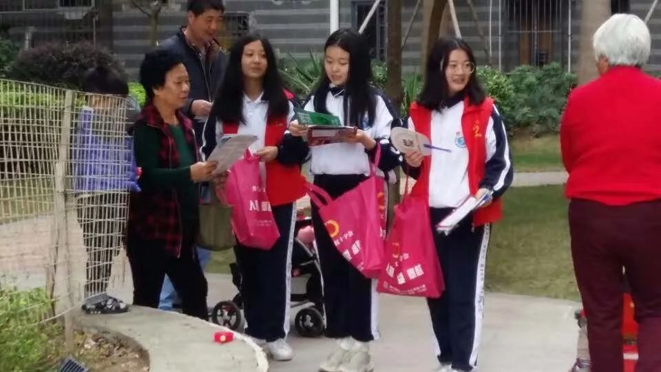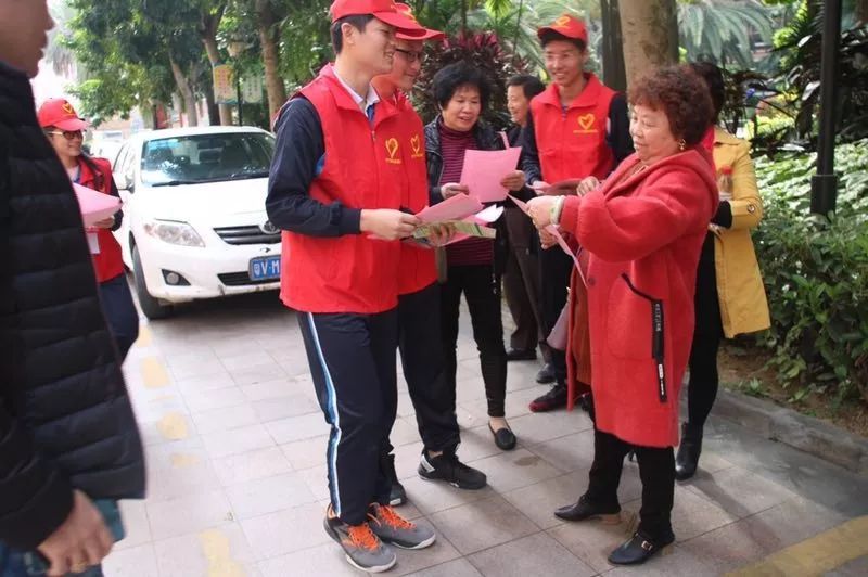 志愿者在流沙西街道尚堤中央住宅区、玉华路、平湖菜街、二中广场路开展宣传