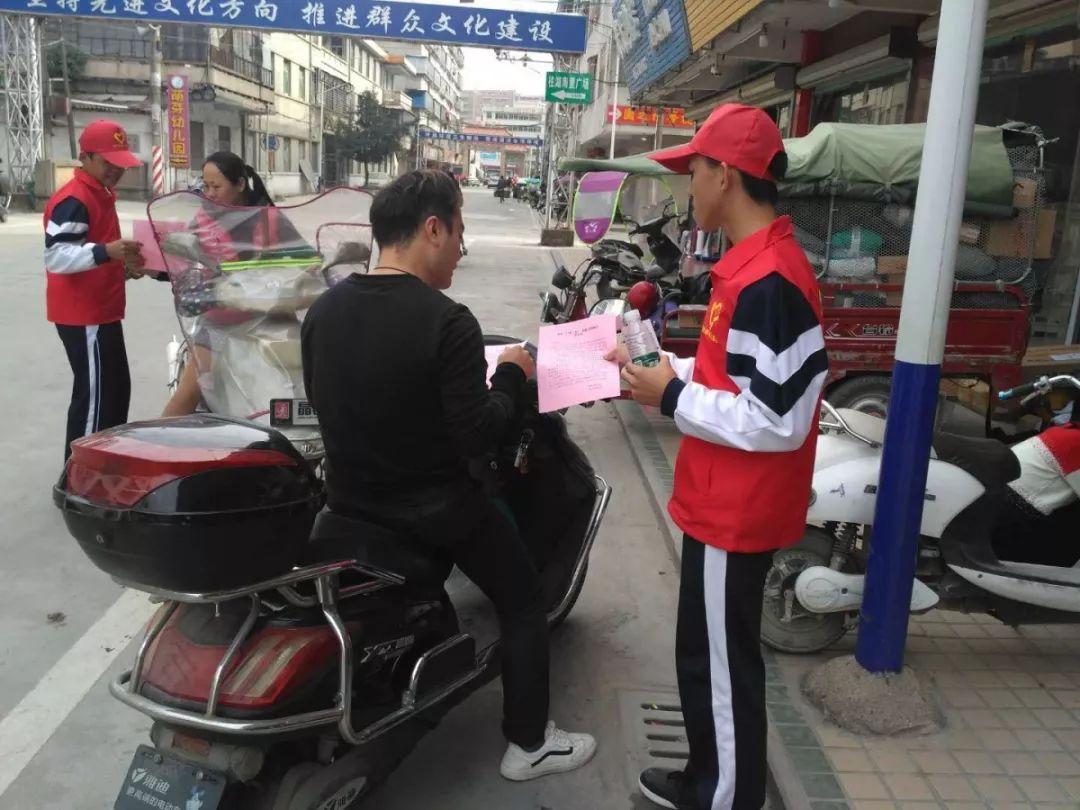 志愿者在燎原街道金润小区、民明大道、小学前路开展宣传
