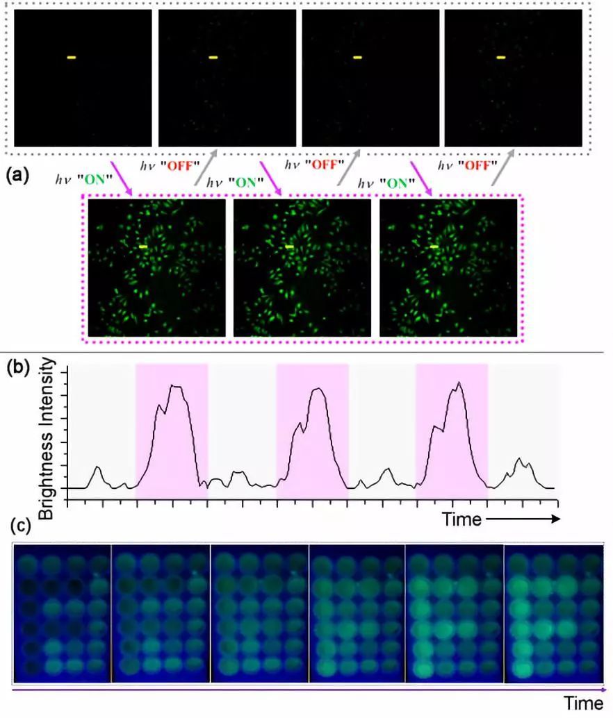 这种通过物理方式(非化学反应)驱动的具有自恢复特性的自主光开关,与传统的控制方式相比,能够在最大程度上避免副反应和疲劳积累的情况下,经历快速、可逆的刺激响应。可逆循环使用可达千次以上。当这种分子开关的操控和影像行为的结合以后,我们便能利用光响应开关造成前后发光信号差异,帮助检测目标从高度复杂的背景信号中以“闪烁”的方式“脱颖而出”,实现动态增强可视化。