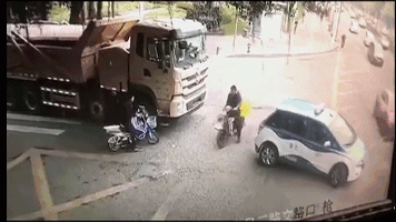 一段泥头车碾压骑车者的监控视频