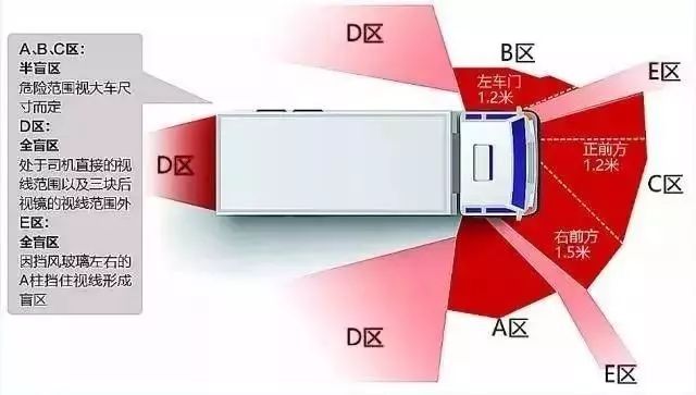 图有颜色部分均是泥头车的盲区范围,其中D、E区属于泥头车的全盲区,A、B、C属于半盲区。